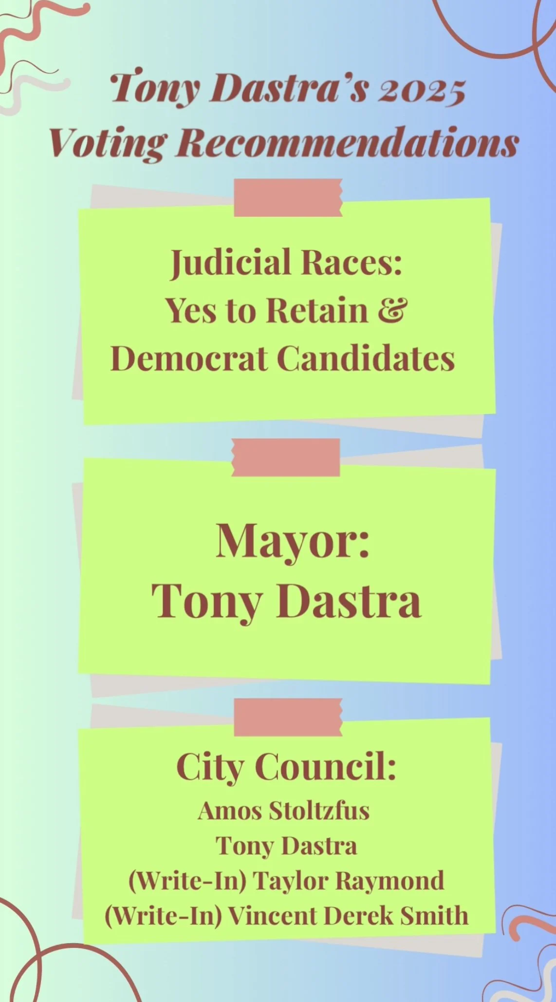 So, as I alluded, I will need a City Council that I think will make more constructive use of Council’s powers, and so I am writing-in candidates. These are people I believe will take action. For City Council, vote for Amos Stoltzfus and I; Write-in TAYLOR RAYMOND and VINCENT DEREK SMITH.